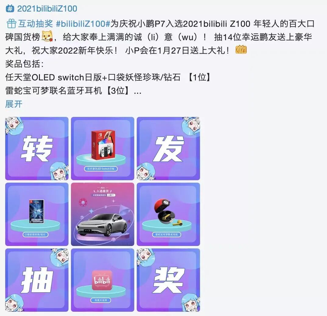 而后,一条「庆祝小鹏 P7 入选 2021 bilibili Z100 年轻人百大口碑国货榜」互动抽奖,奖品包括 Switch 掌机、周边等,吸引目标用户。