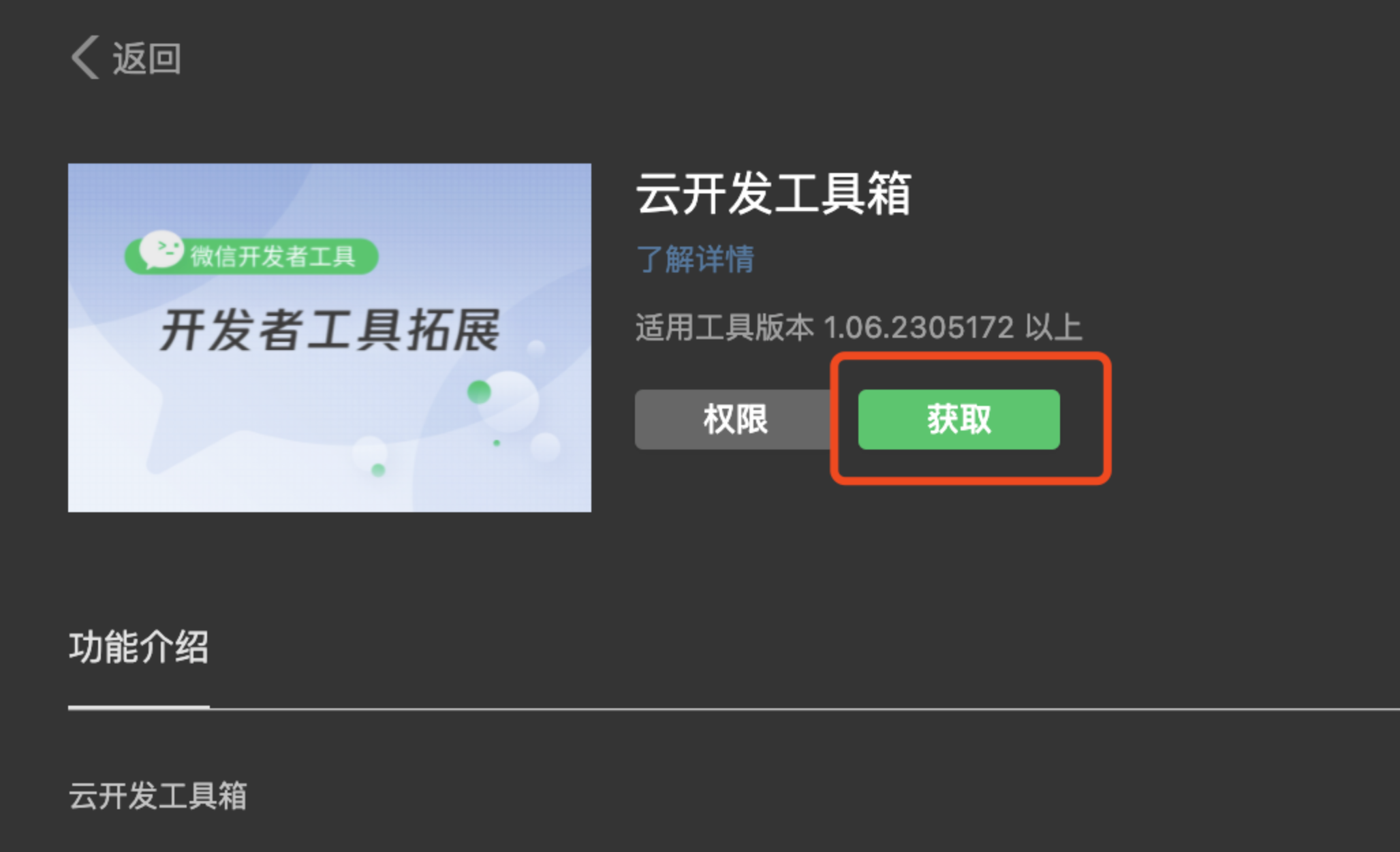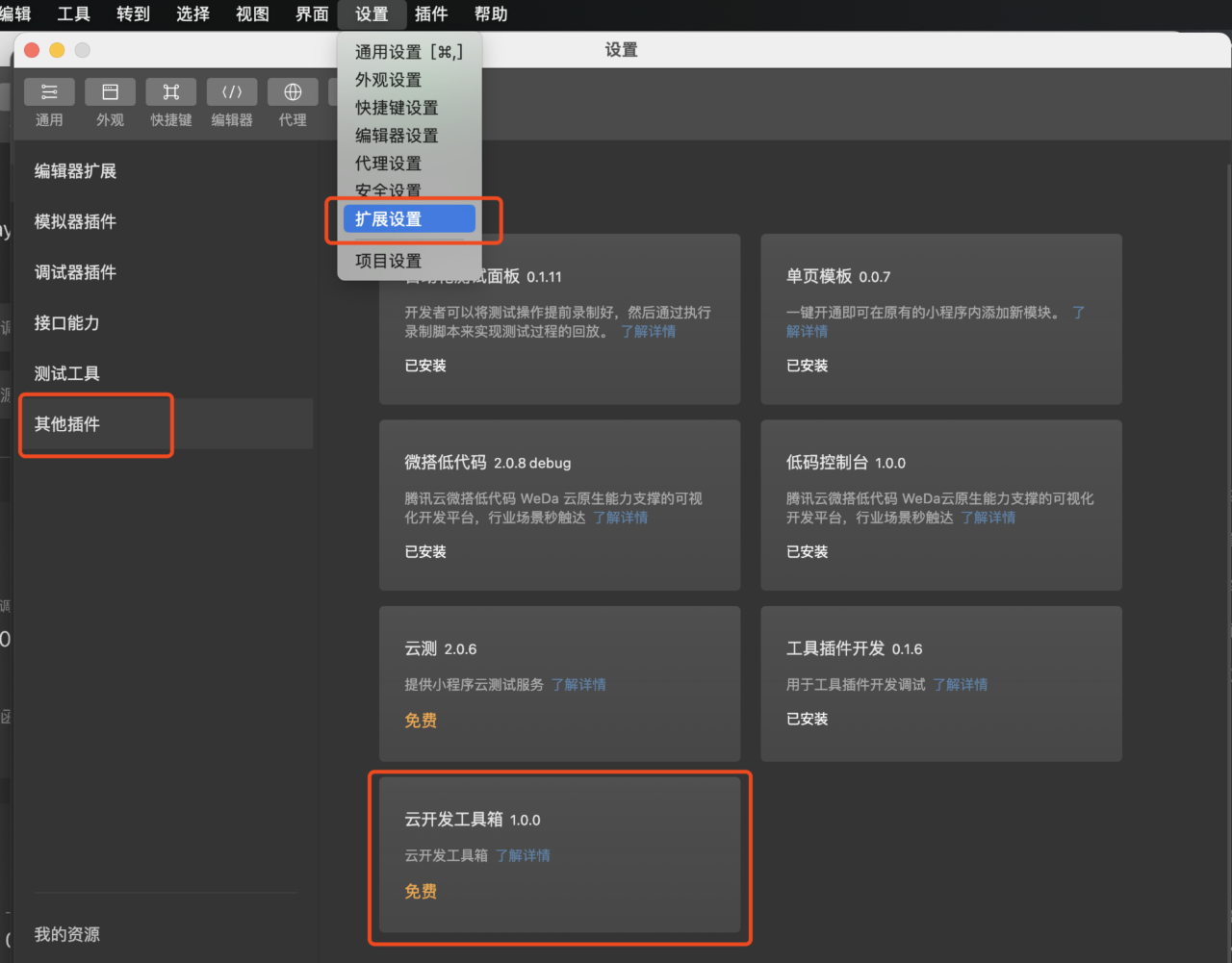 打开微信开发者工具,前往顶部菜单栏「设置」-「扩展设置」-「其他插件」里安装“云开发工具箱”
