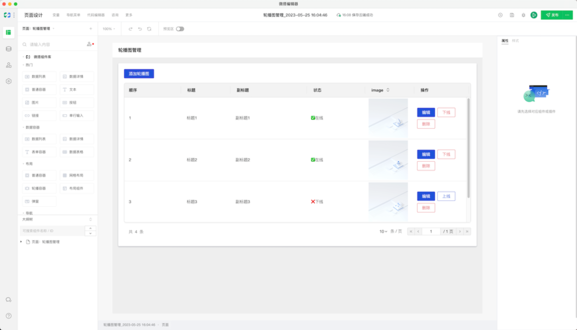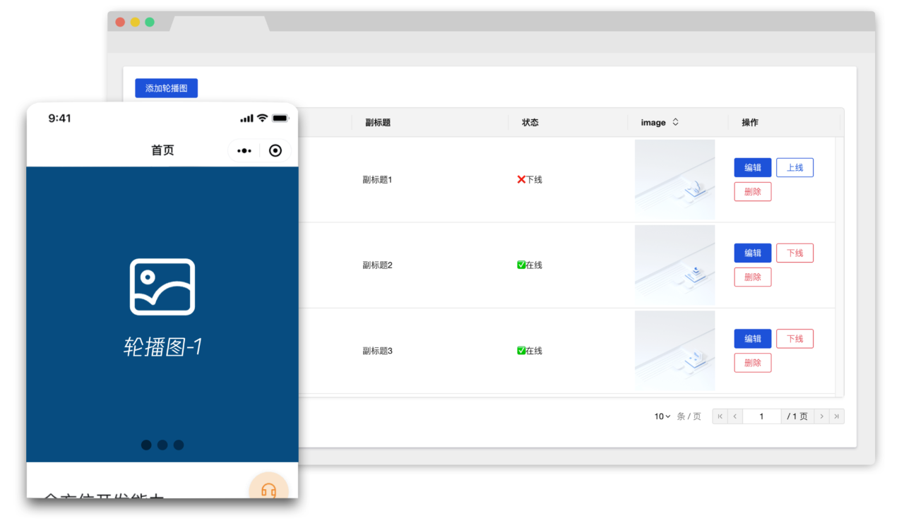 - 能力三:轮播图管理,用于管理轮播图的数据,包括创建、删除、上下线操作,数据存储在云开发数据库中,并提供前端轮播图模板代码
