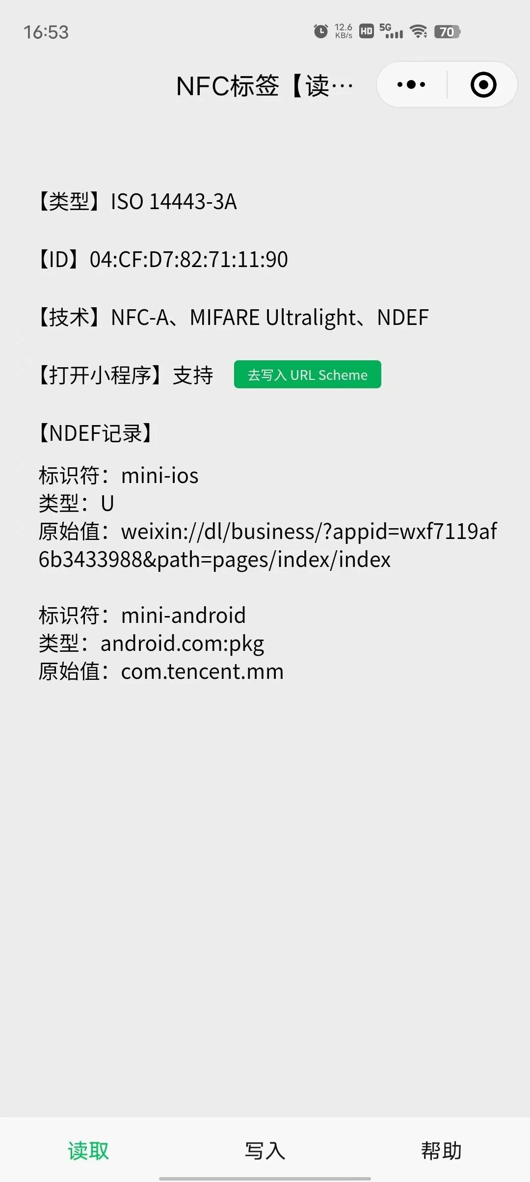 3)小程序 URL Scheme 转换 ArrayBuffer 时,在字节数组首位需额外加上 0x00;(因为 URI 记录数据的第一个字节为协议字段,小程序 URL Scheme 没有对应协议,故用 0x00,其实微信官方在写小程序 writeNdefMessage API 时,可以把这个逻辑封装起来,减少开发者学习成本)