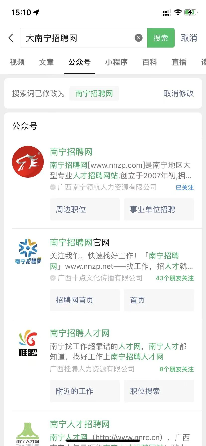 按昵称搜索无结果返回,按公众号账号搜索nnzpcc,可以返回。