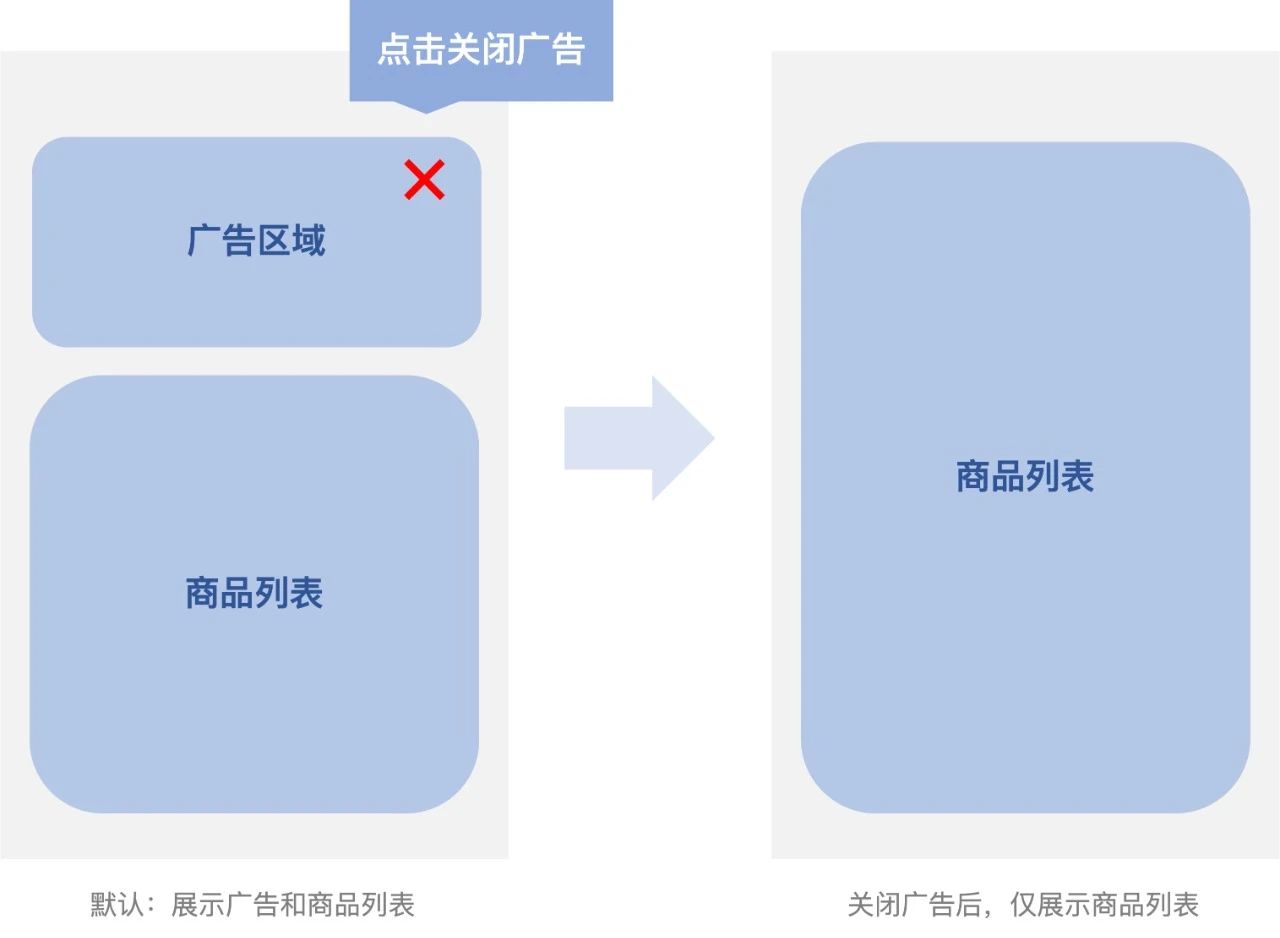 常见的一种设计方式是设计一个隐藏按钮,当用户不想看广告的时候把广告隐藏掉,隐藏之后商品列表就有更多展示空间