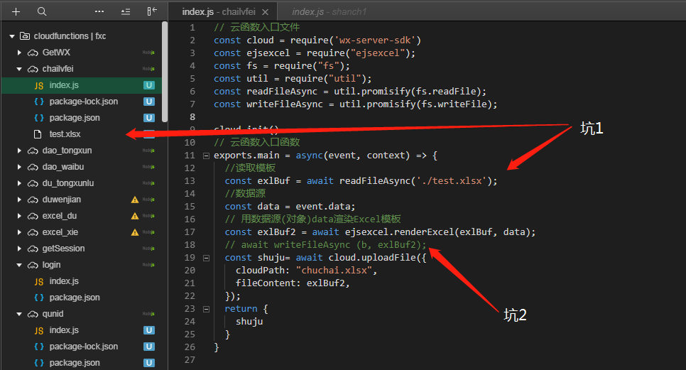坑1:readFileAsync不能读取小程序云的数据存储,用了好多方法也没能成功,最后只能将模板文件写入云函数目录中。