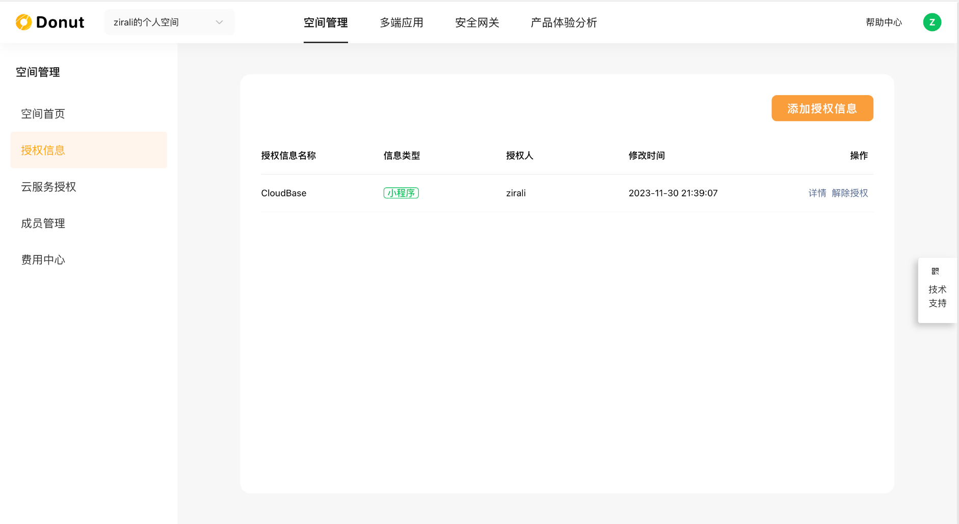 在一键接入这里选择小程序,将会拉取此空间下授权的小程序,如果空间里没有任何小程序授权,则可以根据指引新增授权,需要小程序管理员(注意不是开发者和运营者之类的)扫码确认。