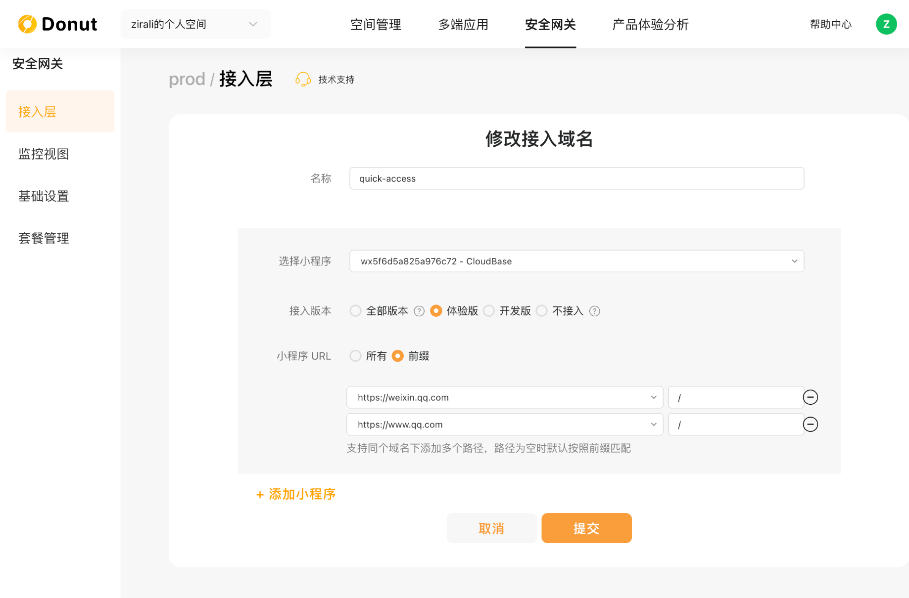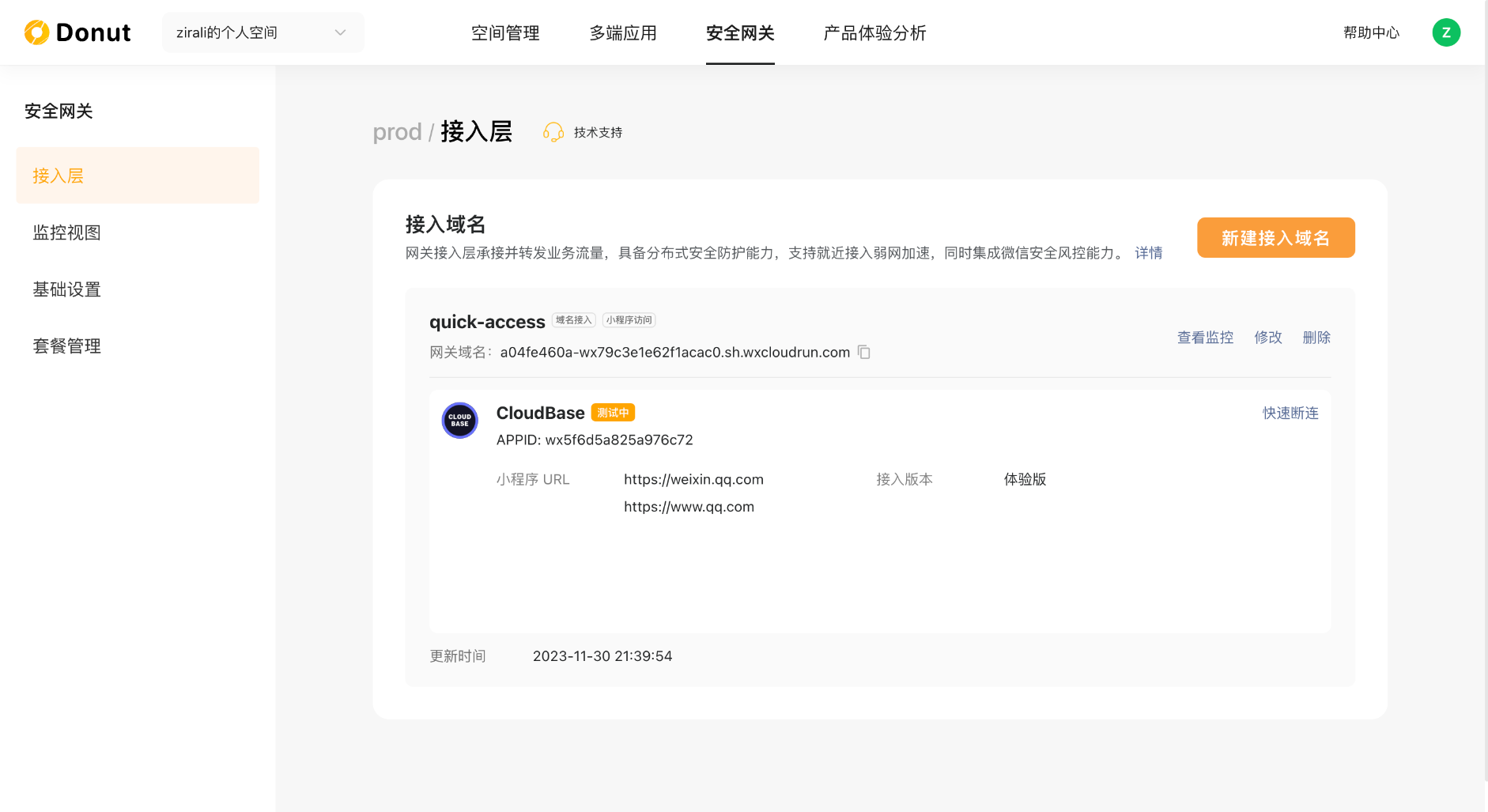 这里主要解释一下接入域名,接入域名其实对应的是一个个的网关域名(在前期安全网关产品功能中有直观体现),在后面的接入多端中会应用到。小程序一键接入可以直接忽略掉。你可以将其理解成一个链路方案,该方案下可以有多个小程序或者一个小程序不同版本的不同域名配置。(比如我希望开发者版A域名走安全链路,体验版B域名走安全链路)