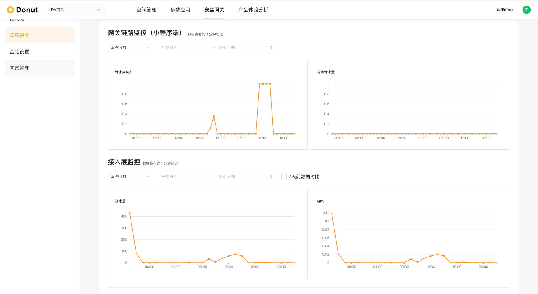 8. 在监控视图中可以查看网关下的小程序端链路调用情况,可以通过观察请求成功率来验证安全链路的兼容稳定与否,结合自己的测试来判断是否应该继续接入。