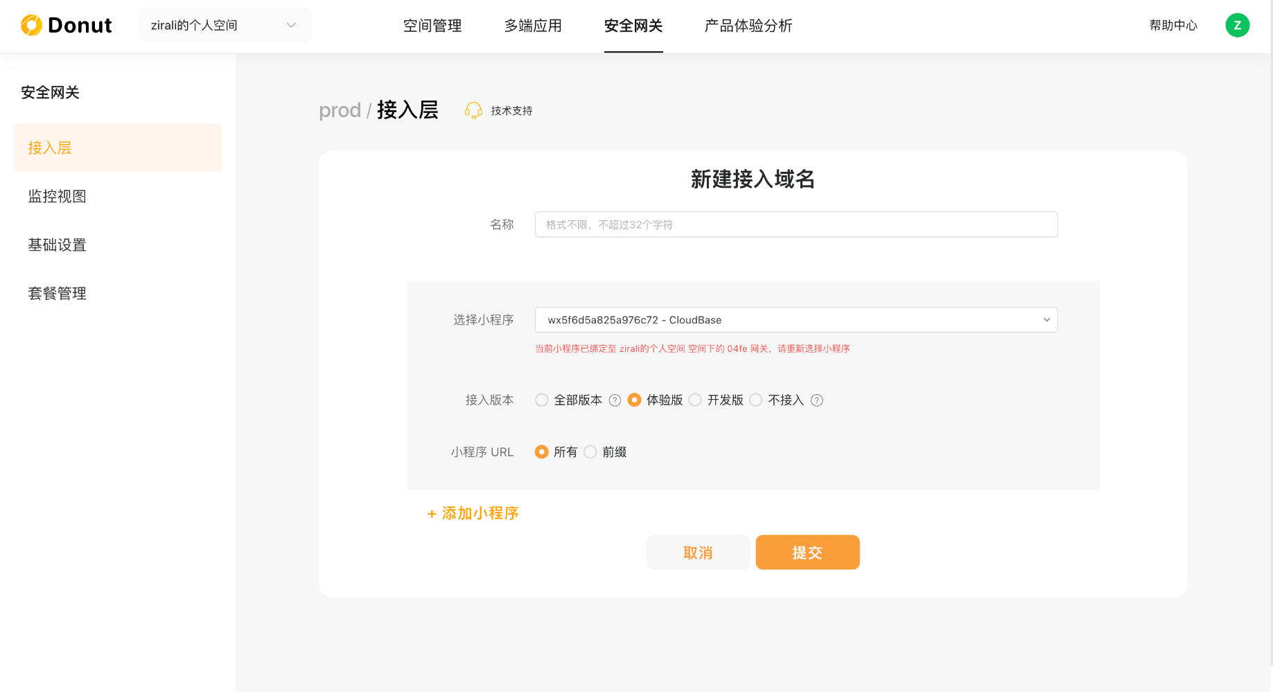 7. 你可以新增接入域名,选择不同的小程序。(需要注意的是一个小程序只能被一个网关的一个接入域名绑定)