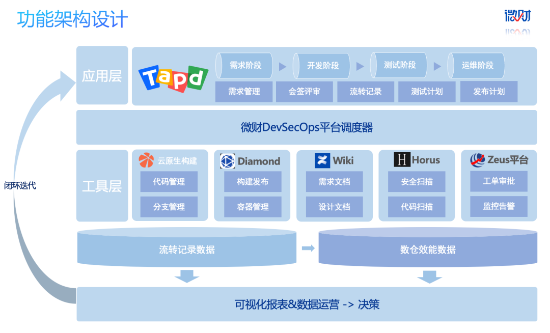 微财的创新之处在于没有强行推翻旧系统,而是以TAPD作为需求管理核心,并在其与自研平台(如测试平台、发布平台)之间设计了一个智能“Zeus DevSecOps平台”作为串联所有系统的可扩展基座。