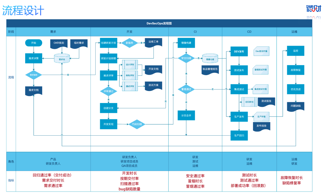 微财将产研全生命周期划分为需求、开发、CI、CD、运维五大阶段,并明确了每个阶段的负责人和关键指标。这一标准化流程为数据采集和规范化管理奠定了坚实基础。