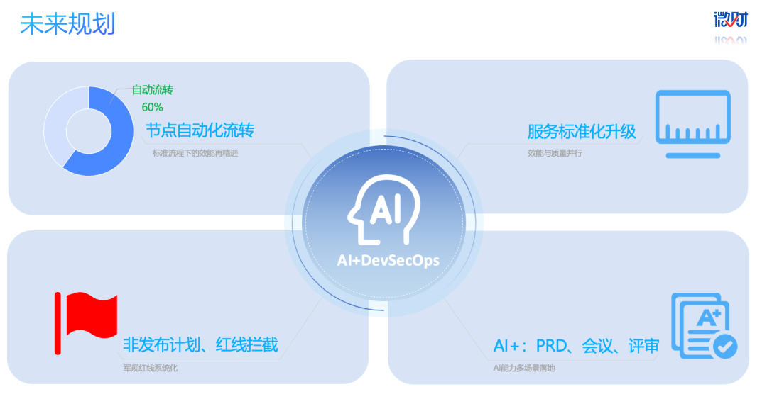 然而,规模扩张带来了典型的“大企业病”。王学森指出:“早期我们追求极致效率,一句话需求就能快速迭代试错。但到2022年,团队规模快速扩大,业务需求压力持续升高,系统复杂度指数级增长,团队预判该趋势下,产研效能与交付质量将会无法逃避的持续下降。微财开始构建内部的垂直方向的效能提升工具,如发布平台、文档管理、需求管理等,在垂直领域均有明显的效能收益。