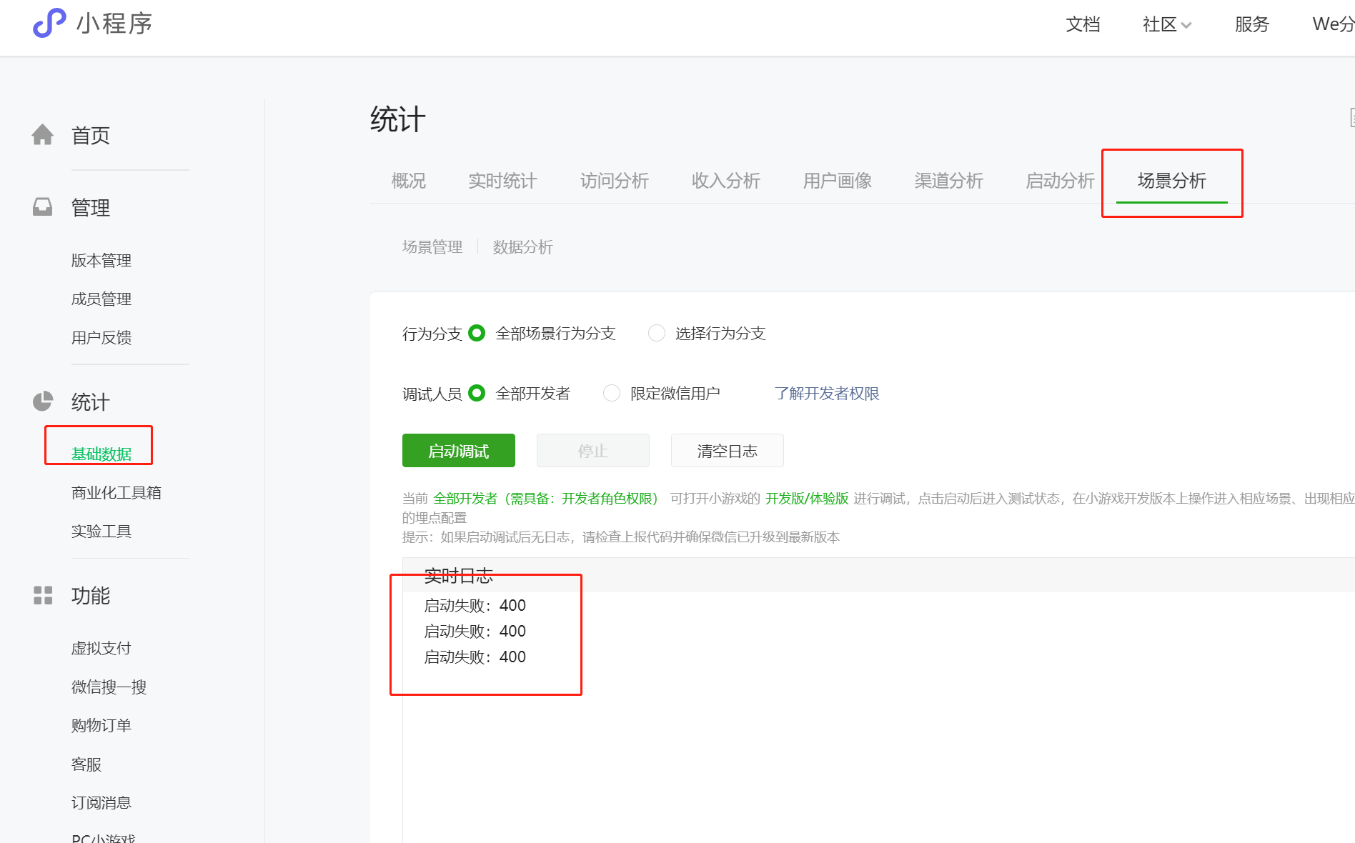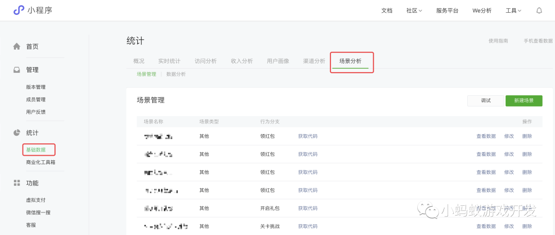 打开小程序后台,在“统计”,“基础数据”,找到“场景分析”。我们在小游戏中上报的数据,未来都会显示在这里。