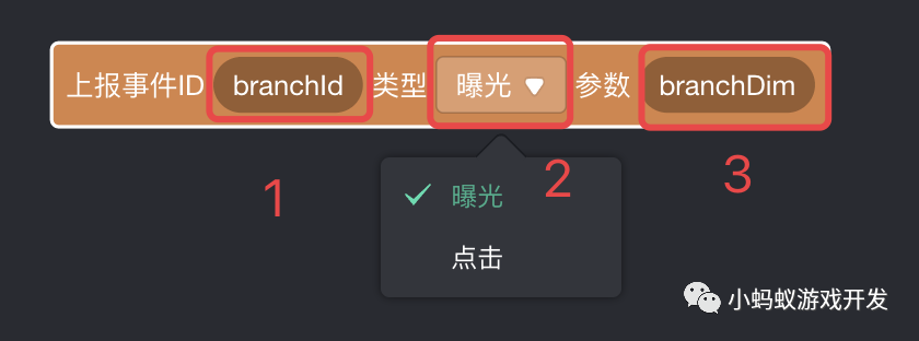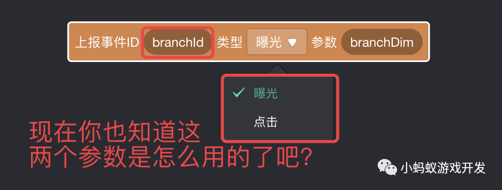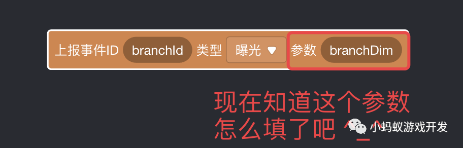这个积木块有三个选项,第一个是 branchId,第二个是类型,曝光还是点击,第三个是一个可选择的参数 branchDim。稍后呢,我们会讲解如何使用这 3 个选项。