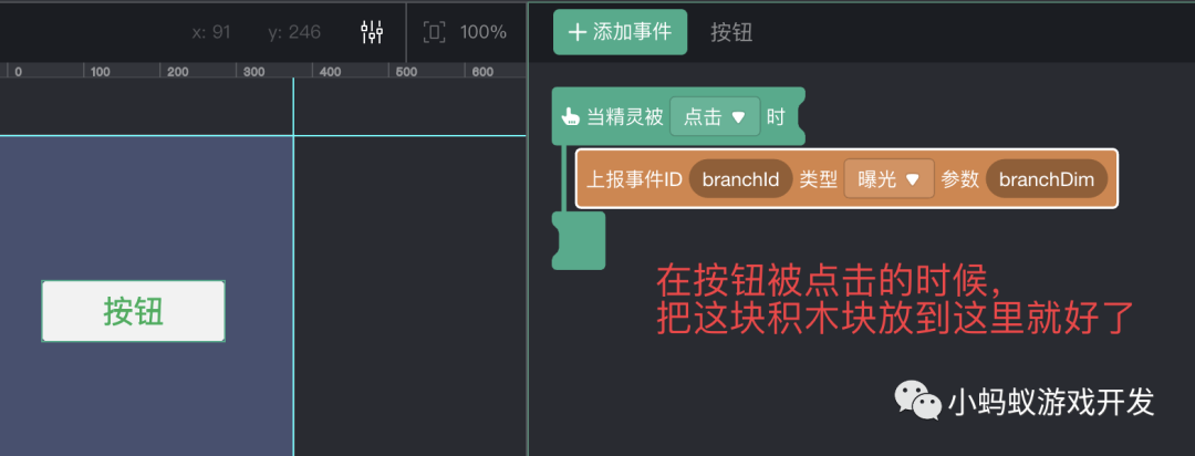 这块积木的使用方式也非常的简单,你只需要把它放到任何你想要统计数据的地方就可以了。例如,当前你想要统计游戏中的一个按钮到底被点击了多少次,就可以这样使用。