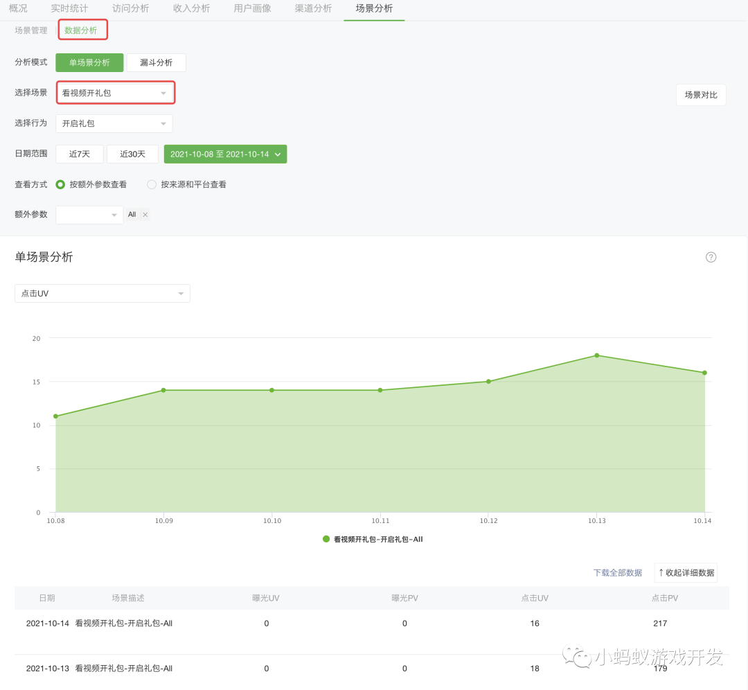 发布之后,你就可以在“场景分析”中的“数据分析”中看到你的小游戏中所统计的数据了。