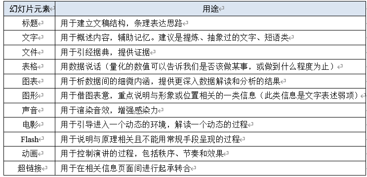 总之,幻灯片元素是否丰富、易懂,直接影响着倾听与表达呈现的效果,主要幻灯片元素的使用要领见表 2:
