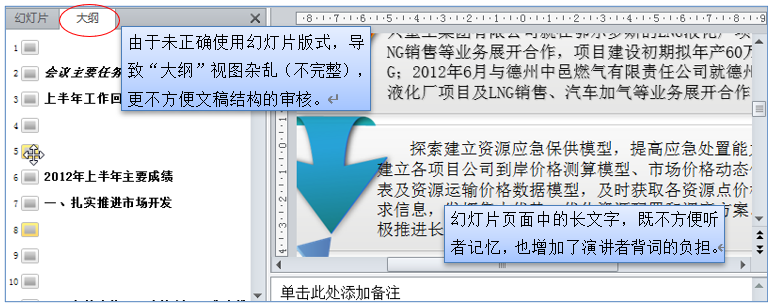 如果将演讲者要说的话都罗列于各张幻灯片中,就相当于一个“题词板”。演讲者就很容易变成面对幻灯片的读白人。而读白念台词一般都不是管理者的强项,他们更希望通过关键词、数据、图表等元素进行说明或解读式的表达。所以,题词板将严重影响到演讲人的台上发挥。