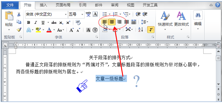 如果我们将这个排版不正确的段选中(显示反白状态),立刻就可以通过“开始”选项卡的“段落”组发现,是那个“居中”按钮高亮着。只要单击一下“居左”的按钮,该段落就可以实现预期的排版效果了。