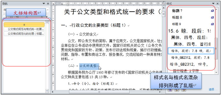 现阶段职场上使用Word软件制作的电子文稿,大多显示为图 5的状态,即左侧“文档结构图”内不能显示全部的文稿结构,右侧“样式表”内显示乱版的状态。所以,急待通过培训加以改善,以保证人人、次次制作同类文稿时,借助工具的正确使用以达到既操作相对简单、高效,又可保证版式规范、内容各异的要求。