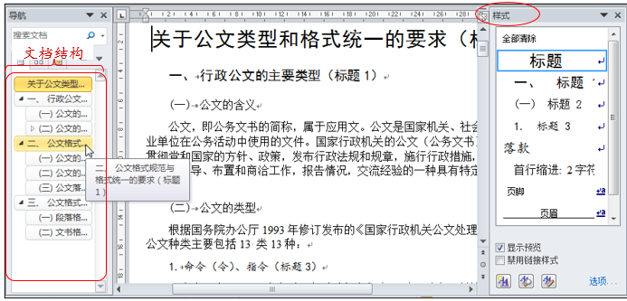在现阶段,把握行文质量的主审内容应当为上述第1条和第2条。前面已经介绍,审核工具可以利用Word软件提供的“文档结构图”和“样式表”。