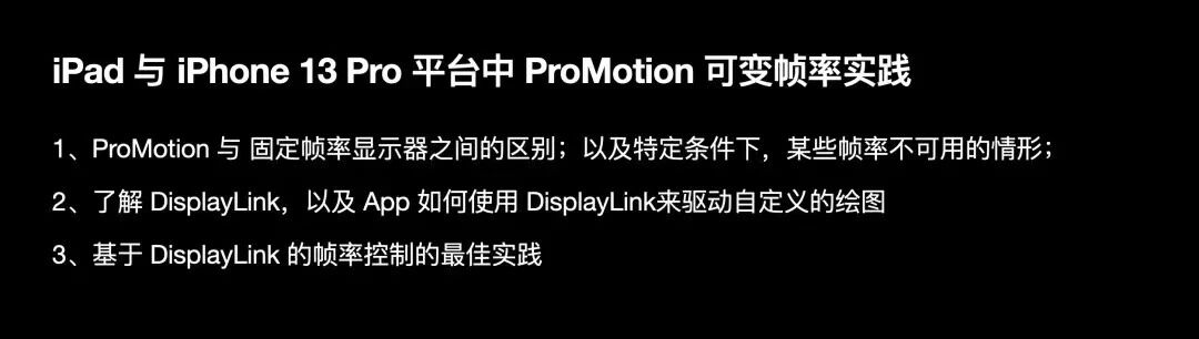 接下来我们来讨论iPad Pro与iPhone 13 Pro中的ProMotion可变帧率技术;ProMotion自iPad Pro 2017年发布以来,可以提供24Hz - 120Hz的刷新率;最近发布的iPhone 13 Pro可提供10Hz - 120Hz的刷新率,iPadOS 15和iOS 15中,省电模式会将ProMotion刷新率降低至60Hz ,也就是120Hz的刷新率并不总是可用;因此作为开发者,需要处理和协调帧的绘制步调以在ProMotion因种种原因而帧率下降时,仍为用户提供正确流畅的渲染内容,接下来我们将讨论 。