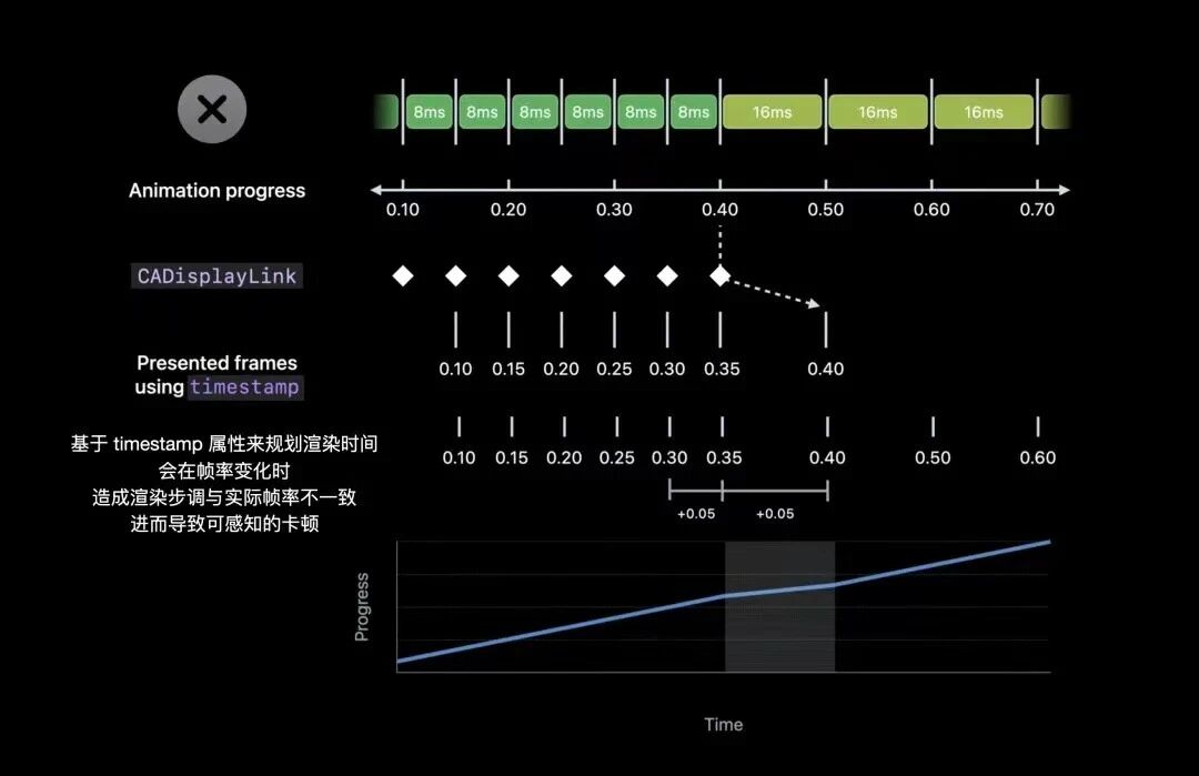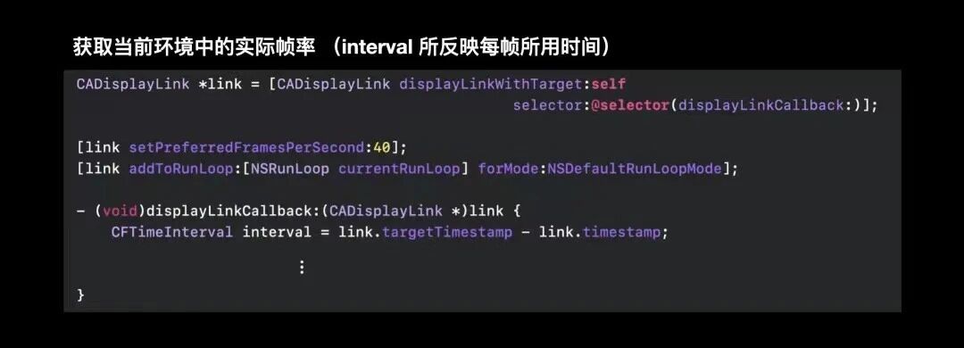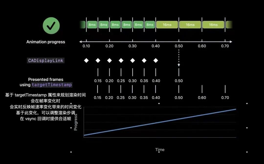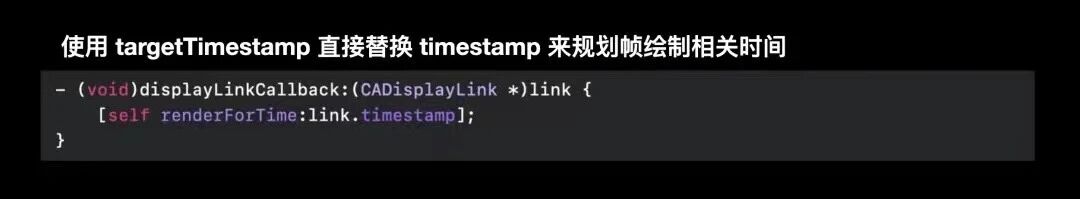 下面的例子中, 当CADisplayLink的实际帧速率发生变化时,targetTimeStamp相较于timestamp属性与实际变化更同步,基于此步调渲染和提交显示的帧,更为顺滑,而不会有明显可感知的卡顿。