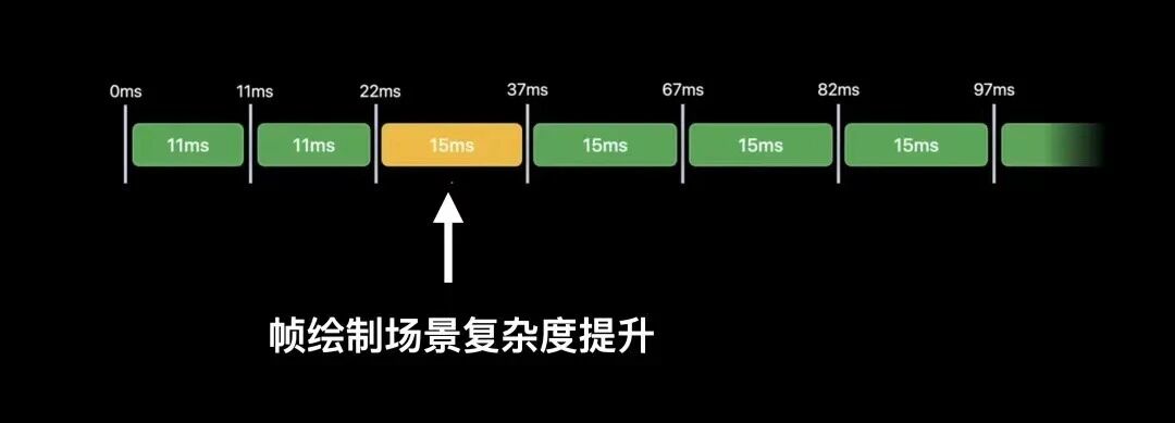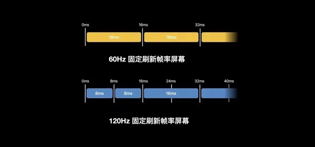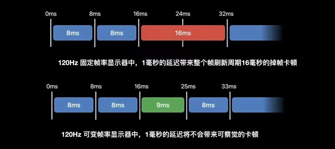 我们对比一下,就可以发现可变帧率带来的好处;在120Hz固定帧率的屏幕中,如果App能够在8毫秒内完成帧绘制,这将给用户带来一个顺滑的120Hz体验,但假设由于场景复杂度提升,某些帧的绘制时间超过了8毫秒,需要9毫秒才能在帧缓存中准备完毕,这会导致前一帧显示16毫秒(重新被展示一次),而不是8毫秒;这种实际耗时16毫秒的帧,会导致呈现给用户的实际显示效果,有明显可察觉的卡顿。
