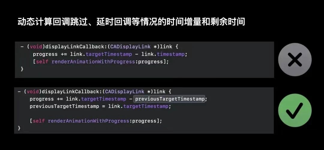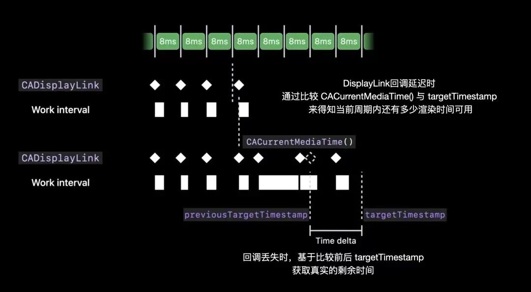 一般而言针对回调延时,会采取舍弃一帧的策略;回调跳过发生时,则一般采取舍弃一帧并提前绘制下一帧的策略;现在假设这一帧的绘制工作花了太长时间,下一次回调且需等待runloop释放,因为这次回调被延迟了,那下一次回调将被直接跳过;这种情况下,如果计划提前开始绘制下一帧时,需要注意这里的可用时间是16毫秒,而非正常的8毫秒;为了追踪到这个时间差,可以记录上一次targetTimestamp与本次targetTimestamp来准确获得这个时间。
