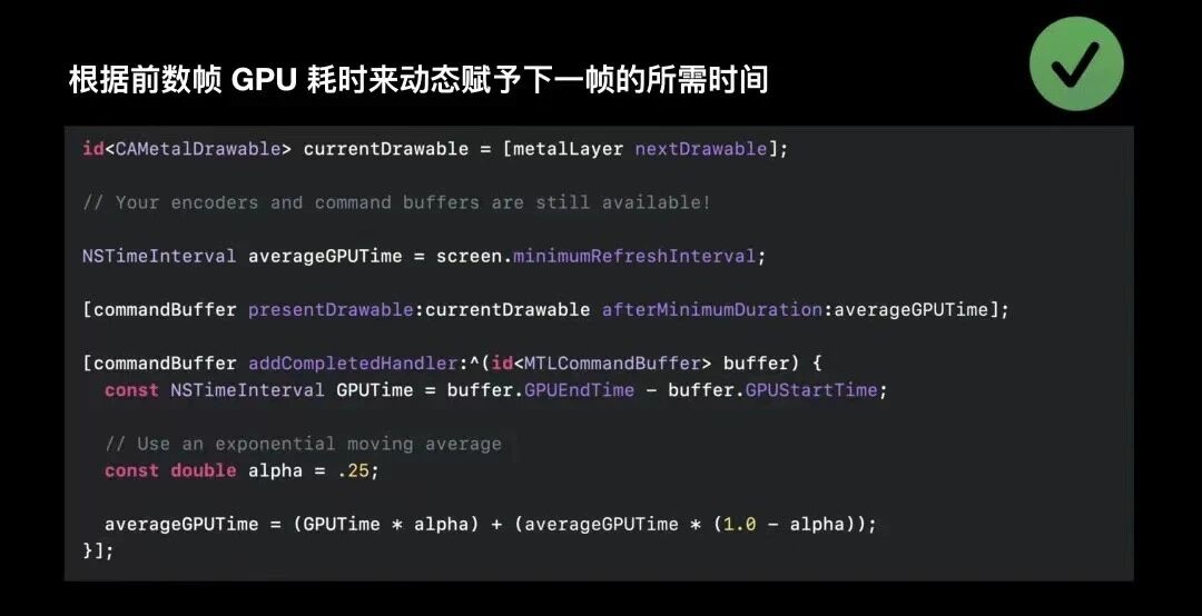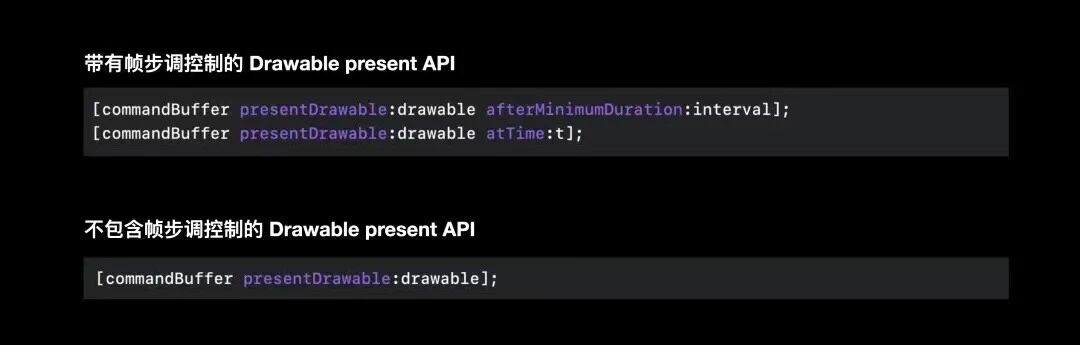 基于Metal绘制技术提供的API,动态调整帧绘制的步调,以在自适应同步显示器上流畅显示。您可以直接使用我们的MetalDrawable相关API ,这些API已经内置了帧步调技,例如presentAfterMinimumDuration或者 presentAtTime;当然您也可以基于present now逻辑自己实现呈现逻辑和自定义计时器管理。