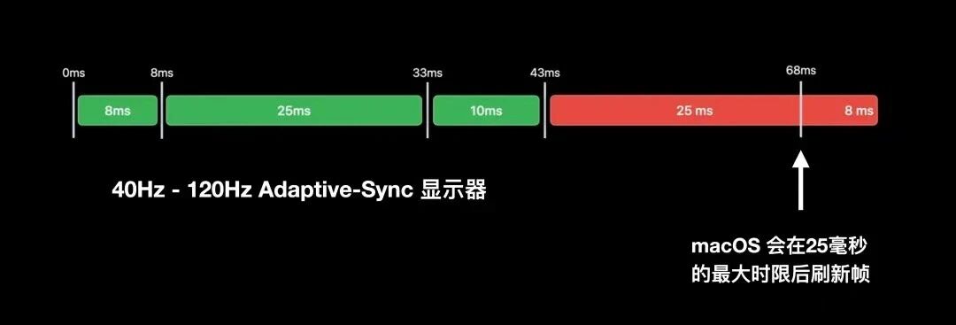 在Adaptive-Sync显示中,每一帧都有一个可变的时间窗口,这个时间窗口替代了原有的固定的帧刷新时间间隔;这个间隔取决于具体连接的可变帧率显示器的帧率支持范围;下面以可变帧率40-120Hz为例,这意味着每一帧可以在屏幕中展示8-25毫秒;但需注意,一旦一个帧的展示时间超过了最大的25毫秒的极值,系统就会强制刷新帧,刷新期间会有短暂的不可用时间。