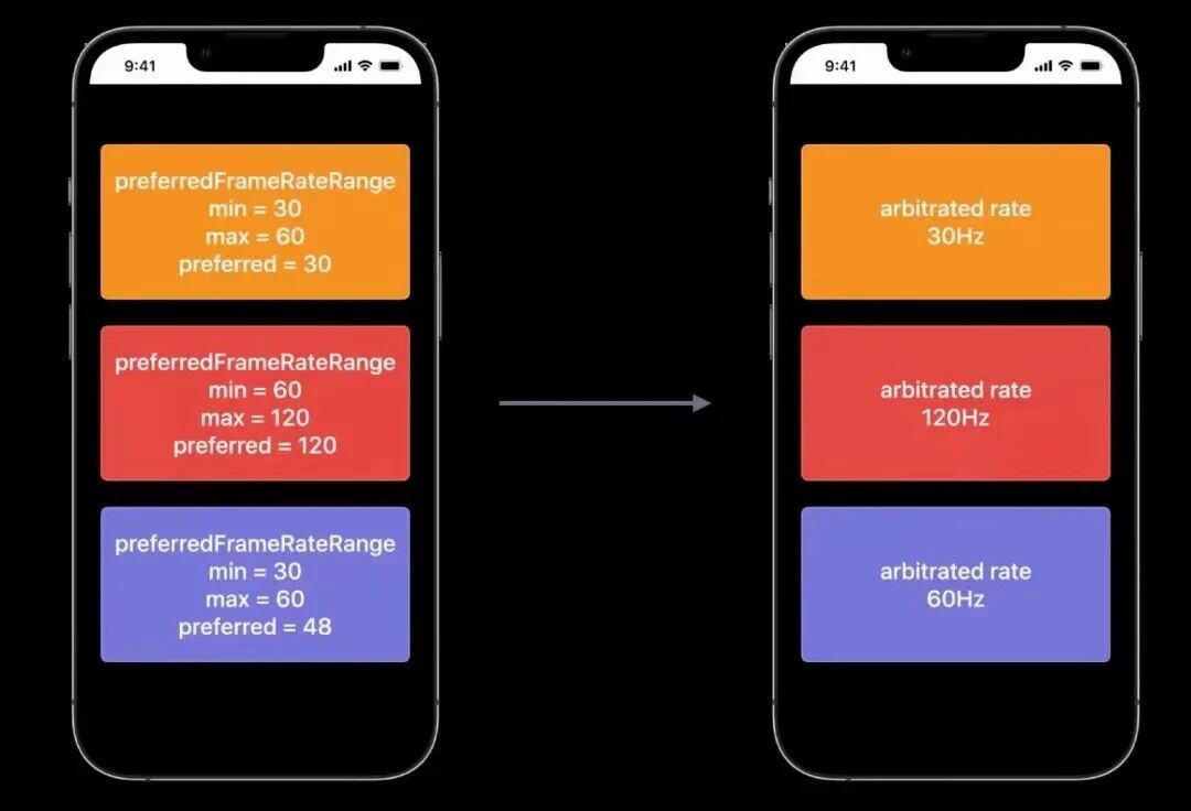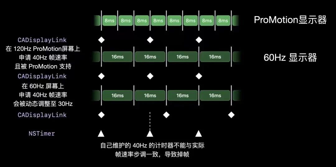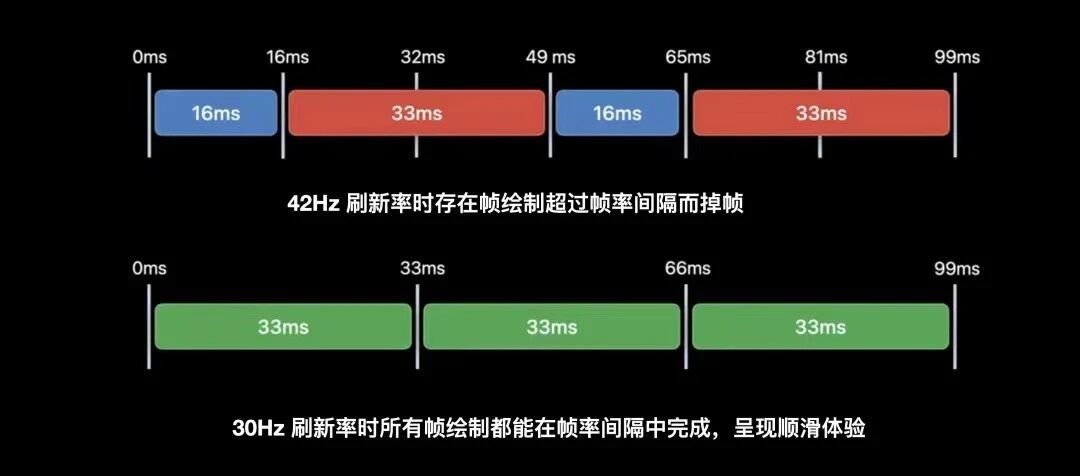 请注意在ProMotion中,您可以通过给setPreferredFramesPerSecond赋值,来声明您想要的帧率,但由于ProMotion支持的帧率是有限的120Hz、60Hz、40Hz、30Hz、24Hz、10Hz(10Hz只有iPhone支持),因此申请在这些既定帧率之外的帧率(如68Hz),系统会自动选择一个与您声明帧率就近的支持的帧率来显示60Hz);具体真实帧率逻辑会类似下图中的场景。