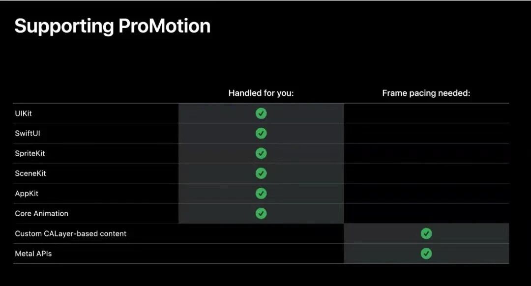首先DisplayLink有基于CoreAnimation的CADisplayLink和基于CoreVideo的CVDisplayLink,前者在除macOS之外的系统中可用,后者在macOS中可用;因为iPad与iPhone 13 Pro中的ProMotion基于iPadOS和iOS ,因而这里我们只讨论CADisplayLink;DisplayLink的vsync callback事件可以理解为与屏幕帧刷新速率稳定同步的一个计时器回调;在设备的帧速率发生变化时,与CADisplayLink的时序回调保持一致的帧渲染步调,是保证App顺滑体验的关键;虽然DisplayLink可以视为一个计时器,但我们不能自己新建NSTimer计时器来实现此逻辑,因为自己新建的NSTimer的步调不可能和可能变化的帧速率同步;通过给CADisplayLink的preferredFramesPerSecond赋值,可以调节vsync的回调间隔贴近于您所期望的值;也可以通过timestamp和targetTimestamp来获取上一帧和下一帧的渲染时长等上下文信息,必要时可以像前述提到的Adaptive-Sync的动态帧率计算逻辑,来实现一个基于当前环境的最大帧率;请注意在iOS设备中,只有自定义的CALayer渲染内容,以及Metal API的内容需要自己控制ProMotion的显示帧率,其他框架和 PI目前苹果已经完成内部实现更新,自动支持ProMotion, 具体支持情况如下: