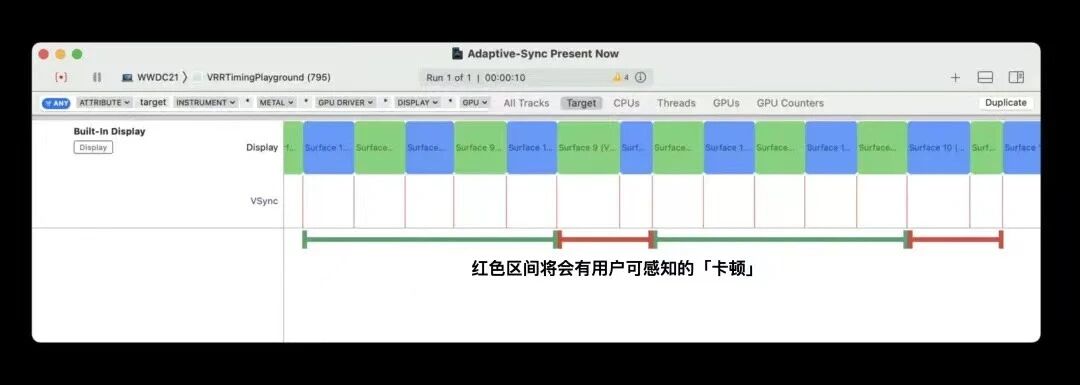 我们来结合一个简单的例子来看看与之前固定帧率显示器相比,我们需要为App做出哪些调整;在这个例子中,我们会获取一个Drawable实例,设置好GPU的工作,完成后呈现在屏幕上;我们需要依赖于GPU完成接下来 Drawable渲染工作的压力来设置帧速率。在固定帧率显示器上,我们很容易知道这不是最好的实践逻辑,因为我们无法保证GPU的渲染频率与显示器帧速率保持一致;但基于Adaptive-Sync显示器和动态帧步调,同样是之前这个场景,我们可以在Instruments中观察到个别帧消耗时间有所增加,这似乎没有问题;但这个例子中的实际问题是,特定场景的单独帧,会周期的被显示,这个复杂场景帧会消耗更多的时间,会形成用户可能感知的卡顿,在下图中红色部分所示: