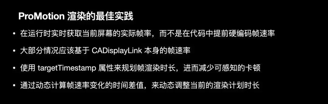 因此,在ProMotion中,尽量使用targetTimestamp而不是timestamp来规划帧绘制时间和提交节奏;在实际使用中,您可以使用targetTimestamp属性直接替换现有代码中所有的timestamp属性;就是这么简单。