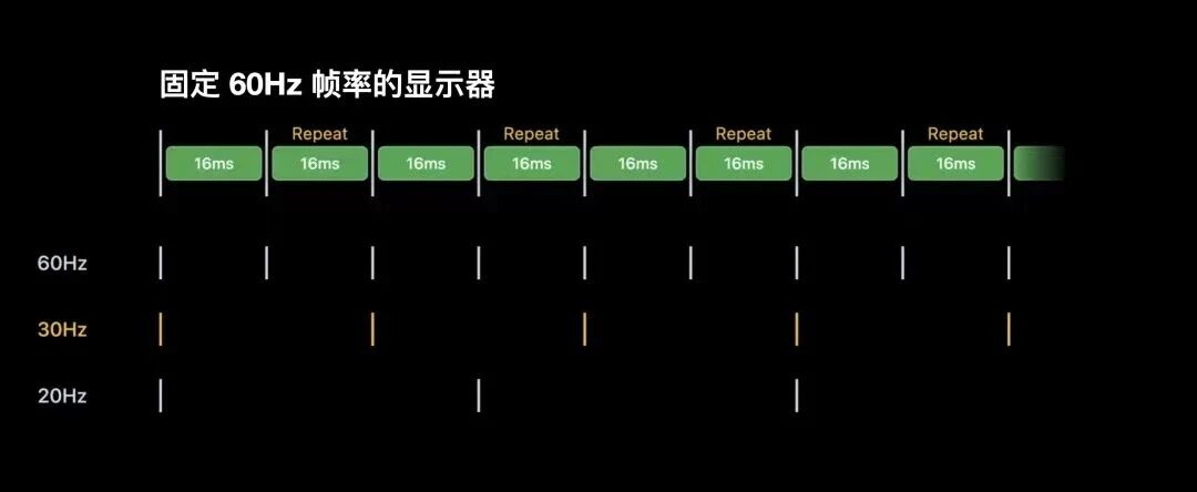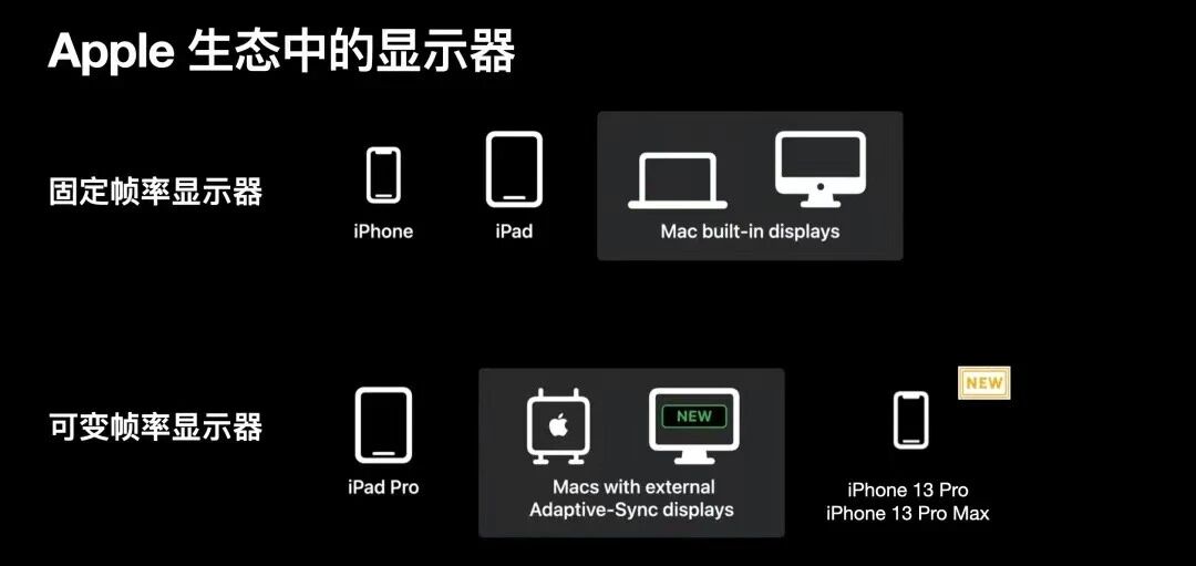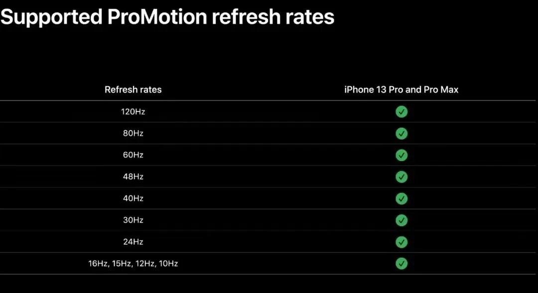 而在ProMotion技术显示器上,帧刷新速率最高为120Hz ,iPad Pro最低24Hz iPhone 13 Pro最低为10Hz,ProMotion在不同刷新频率下,不会重复刷新之前帧,而是根据当下的帧速率动态刷新帧,因此刷新间隔从8毫秒到99毫秒不等;动态的帧率刷新可以节约电池使用时长;请注意ProMotion显示器与Adaptive-Sync显示器有所区别,ProMotion显示器无法支持基于区间的可变帧速率,而Adaptive-Sync显示器支持,例如您可以在Adaptive-Sync 中以110Hz、78Hz、49Hz任意在支持区间内的帧速率来呈现帧,但在ProMotion中只有特定的120Hz、60Hz、40Hz、24Hz、10Hz等特定支持的帧率,后文中将会提到这点。