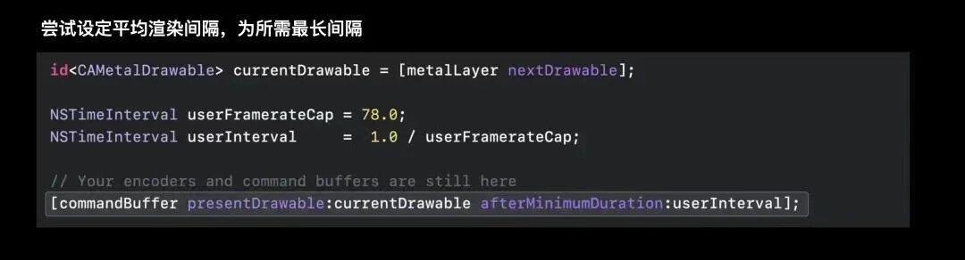 首先让我们尝试以较大的固定平均的渲染速率来解决这个问题;当然在用户可以自定义帧率的情形中,也可以使用该方法;我们尝试固定帧率为78Hz,并将该间隔值传入afterMinimumDuration中。