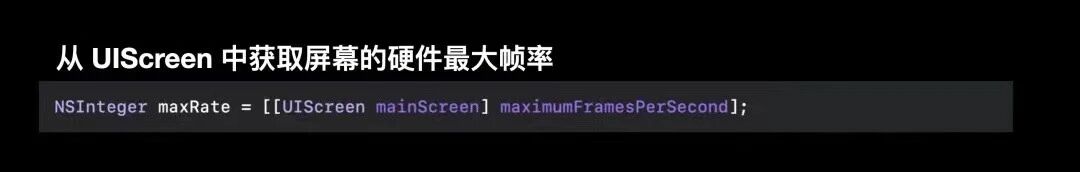 您可以从UIScreen获取硬件支持最大帧速率,在ProMotion显示器中,这个值永远为120Hz,即使有前述的降低帧率的事件发生,这里仍然为。20Hz。