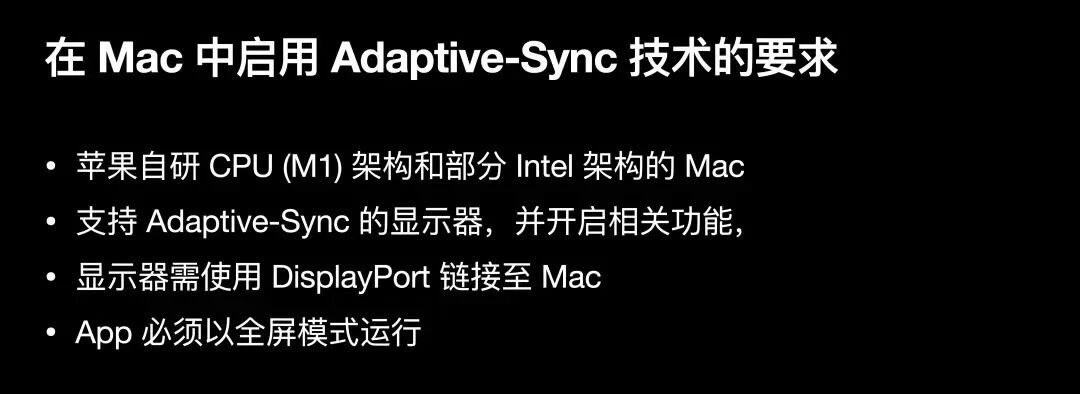 首先需要软硬件的支持,包括M1架构的Mac和近年来部分Intel架构的Mac;其次需要Adaptive-Sync支持的显示器,并开启显示器的Adaptive-Sync功能;显示器与Mac通过 DisplayPort界面连接;其次游戏和App必须以全屏方式运行。