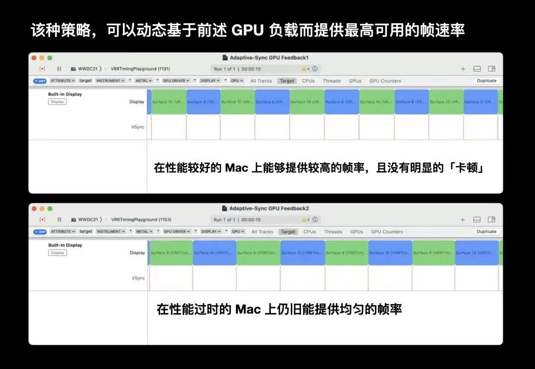 最终我们可以充分利用GPU资源为用户呈现尽可能高帧率的画面;且在不同性能设备,不同的GPU负载下,都无需进行额外的代码更改,如下图所示,性能优秀与过时的Mac都有一个均匀的帧呈现速率。