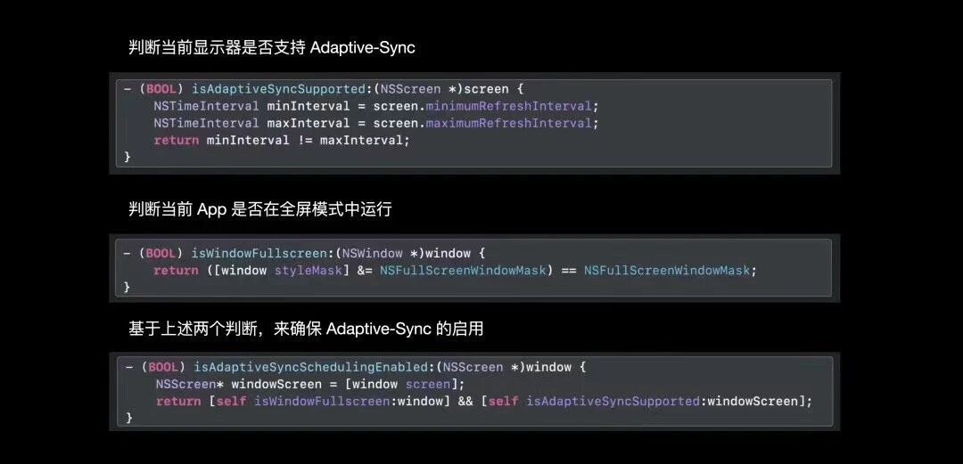 接下来我们深入API来进一步了解Adaptive-Sync首先您需要获取当前环境是否支持可变刷新帧率,对此您可以通过 NSScreen的新属性来判断;在支持可变刷新帧率的环境中,这两个值会反应最大和最小帧率所对应的刷新时间间隔;而在不支持可变帧率的环境中,这两个值会是相等的数值;同时需要判断当前App是否在全屏模式中运行;最后通过上述两个条件,确保Adaptive-Sync已经正常开启。