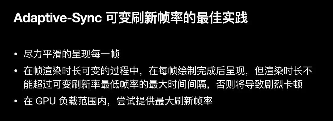 而在可变刷新帧率机制中,我们会建议App在任何情况下都应该尽力提供更高的帧刷新速率,App需要平衡GPU负载和刷新率之间的平衡,最大的帧渲染时长不能超过最低动态帧率的间隔,否则会导致剧烈可察觉的卡顿。因此,您无需担心现有显示器所支持的可用帧率是固定的组合,您可以竭尽所能提交顺滑绘制,也就是尽量均等的安排帧绘制耗时,而动态调整输出的帧步调(帧率),在Adaptive-Sync可变帧率环境中,在可支持范围内的帧率都可以被正常呈现,如48Hz与110Hz。