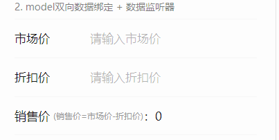 解析:这是商城应用最常见的一个价格计算功能 —— 计算销售价。计算方式为:销售价 = 市场价 - 折扣价。上面的这个例子采用了 model: 和 observers 两个属性相结合实现的:通过 observers属性 为市场价(marketPrice)和折扣价(discount)绑定监听函数,从而计算销售价(salePrice)。并且还能实时同步到内部属性(可以在Component组件内部拿到最新的 marketPrice 和 salePrice值。)