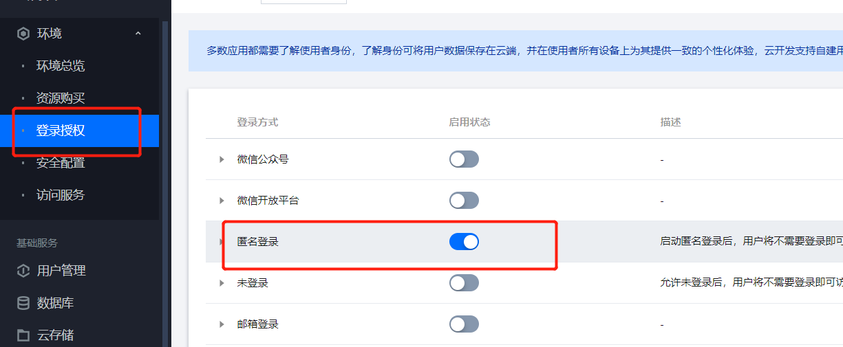 为了增加安全性,建议开启匿名登陆。启动匿名登录后,用户将不需要登录即可访问应用。如果有更严格的安全要求,可以自行开启其它身份验证方式。