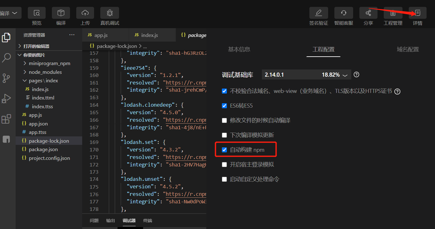 需要注意的是字节跳动开发工具里的构建npm在详情——工程配置——自动构建npm