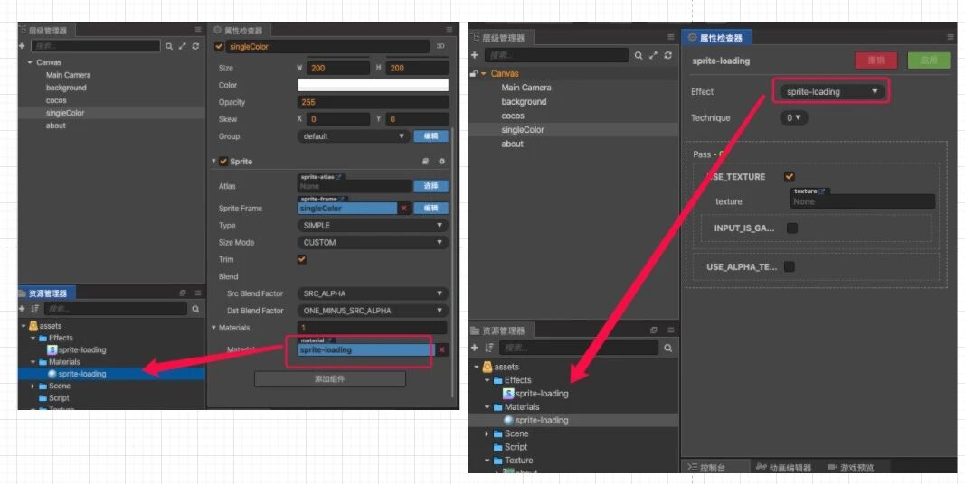 接着新建 effect ,新建 material ,新建 sprite 节点。然后将这几个东西连接起来。
