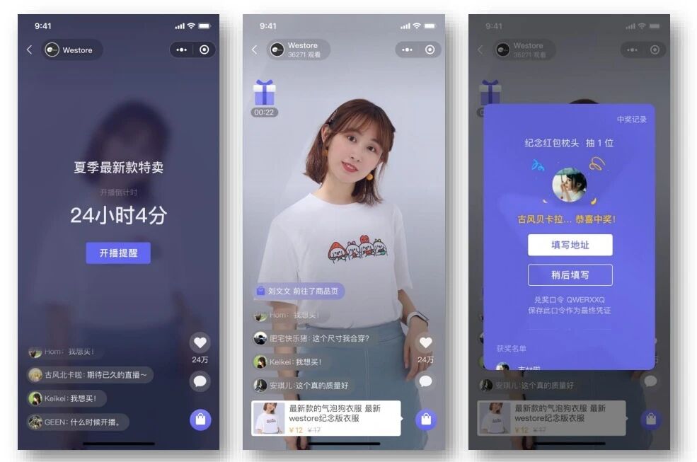 小程序接入直播之后用户可以在商家自己的小程序中观看直播、购买商品、 在直播间内点赞评论抽奖,让用户与主播进行实时互动,完成“边看边买”的闭环。