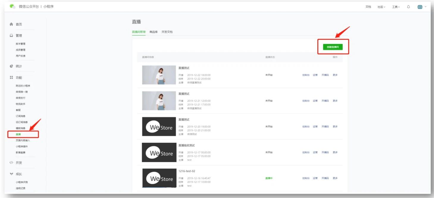 登录小程序后台——点击左侧功能栏“直播”——点击“创建直播间”
