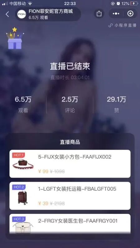 时尚品牌菲安妮官方商城在3月7号—8号连续两天通过酷客多提供技术支持的小程序直播,其场均观看人数65000人,评论数量25000条,点赞291000取得了首播卓越的效果,直播打破销售记录。