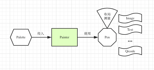 开发者可以根据需求构建生成图片的 Palette(调色板),然后在程序运行过程中把调色板传入给 Painter(画家)。Painter 会调用 Pen(画笔),根据 Palette 内容绘制出对应的图片后返回。