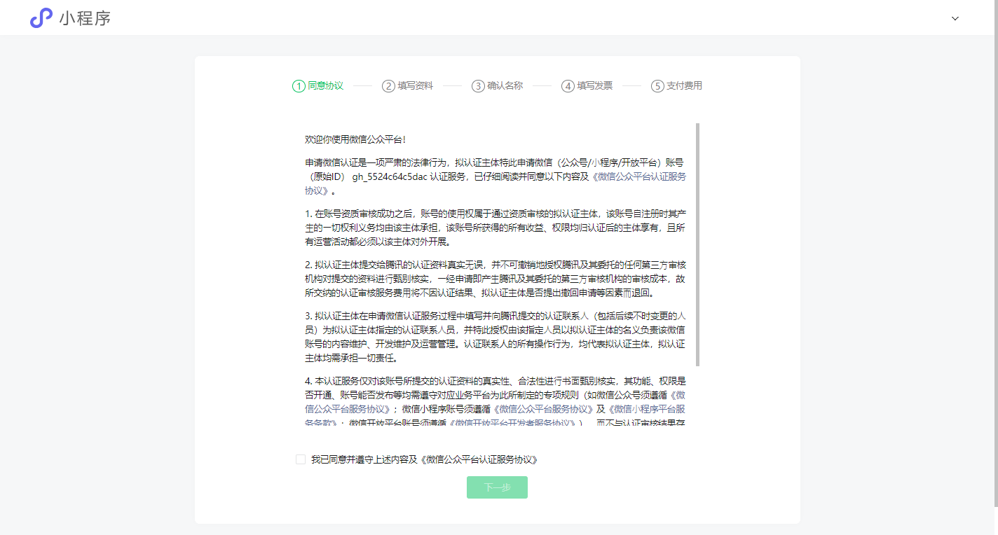 点击去年审后,第一步为勾选同意《微信公众平台认证服务协议》