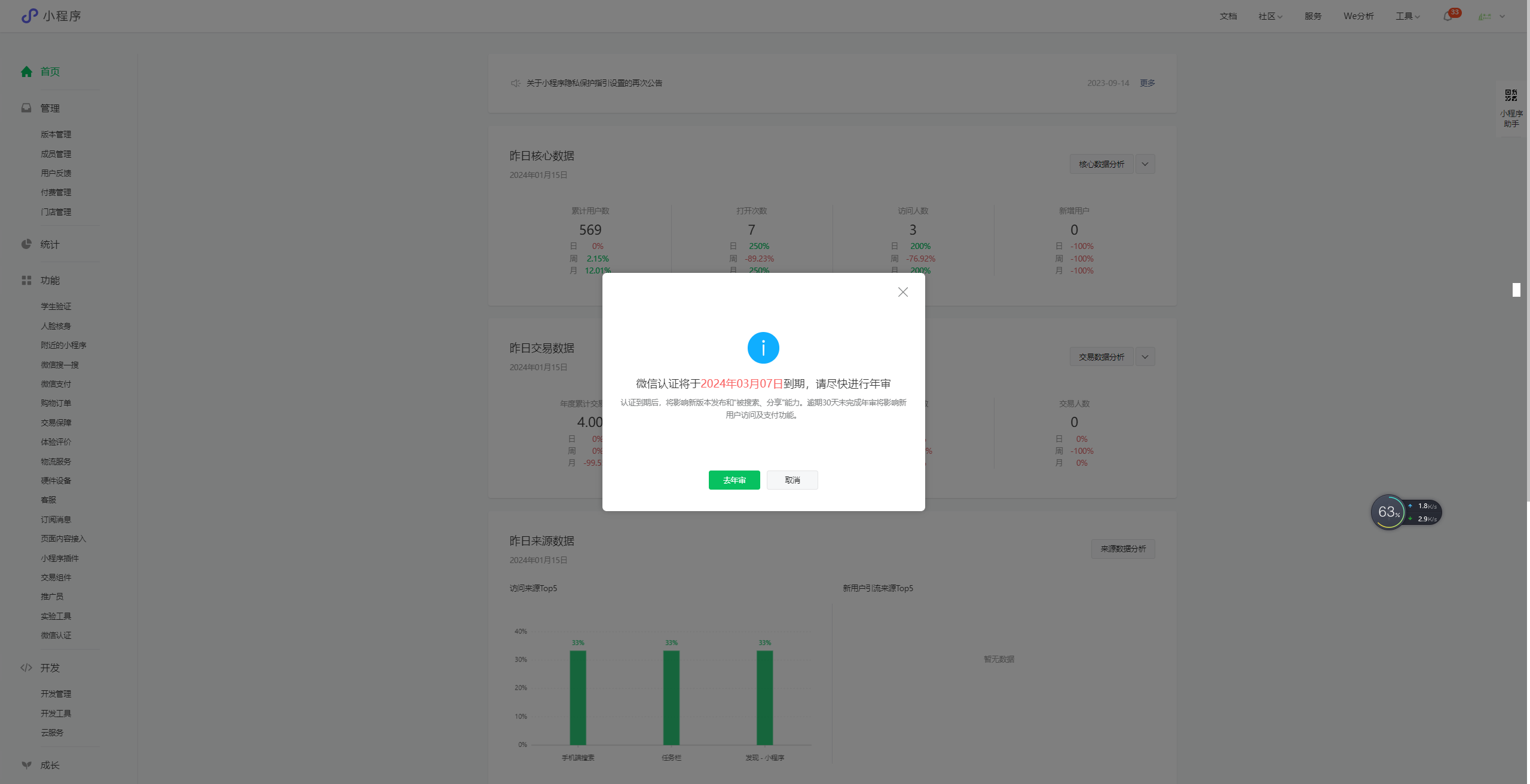 2、因为官方目前对小程序年审制度属于灰度测试,所以暂未收到年审通知的商家,可不用进行年审操作